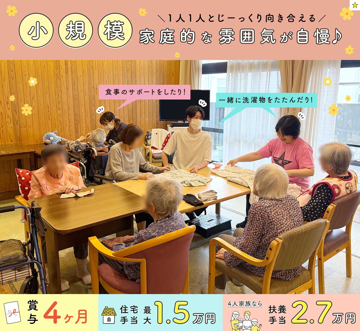 | 給 与 | 月給28万2800円~月給33万円 ※資格や実務経験により、手当や加算あり ※5年以上の前歴加算含む ※夜勤5回分(1回1万円/月4回~OK)、処遇改善2.8万円含む ★収入例(入社4か月目)※別途交通費 ・介福、賃貸、4人家族 月収32万4800円(月給28.28万円+住宅1.5万円+扶養2.7万円) |