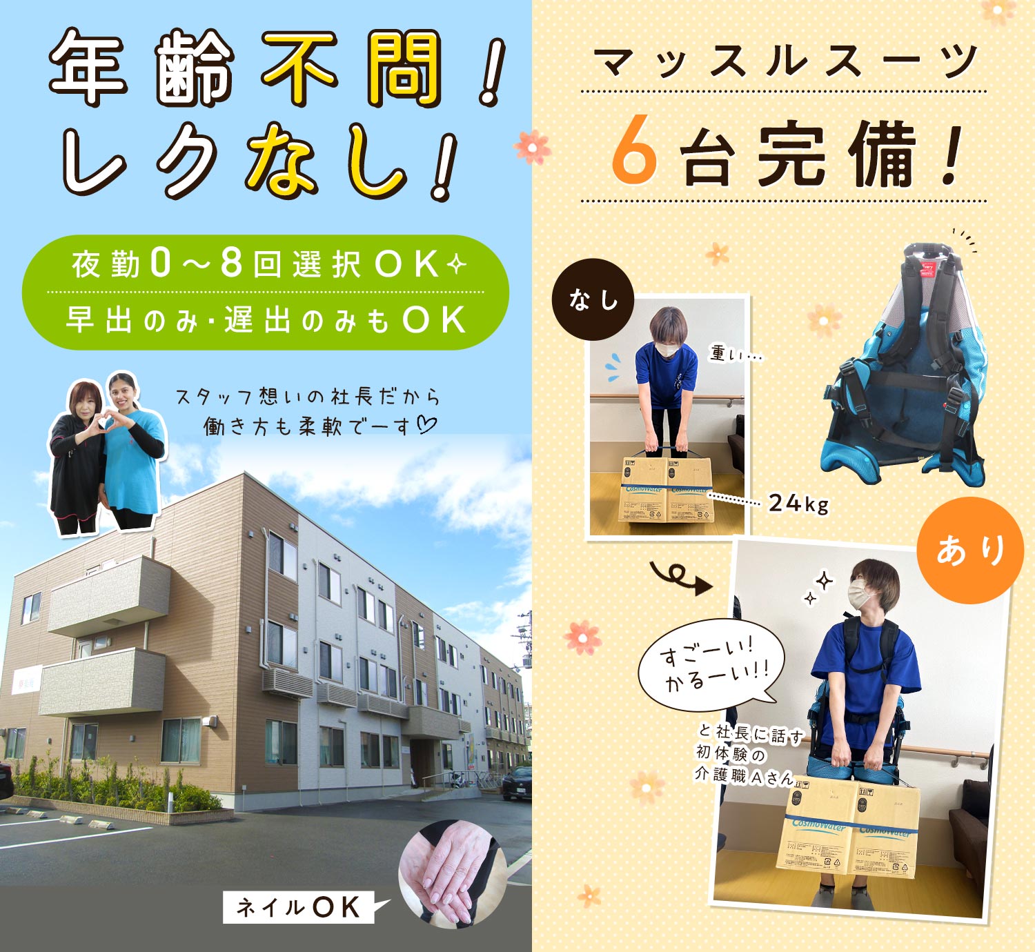 | 職 種 | (1)ショートの夜勤専従介護職 (2)夜勤専従介護職 |