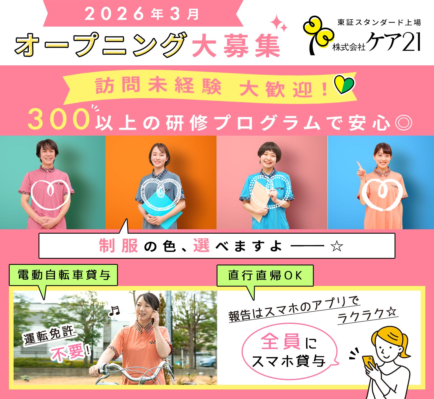 | 仕事内容 | (1)サービス提供責任者/介護福祉士[社] (2)サービス提供責任者/実務者研修修了者[社] 利用者様の自宅へ訪問し、身体介護(入浴・排泄・外出等)や生活援助(掃除・買物等)をお願いします。 また、サ責としてヘルパーのサポートやマネジメント、利用者様との契約、家族面談、「訪問介護計画書」の作成などをお願いします。 ※現場業務とサ責業務の割合は8:2くらいです。 ※訪問エリアは事業所から自転車で行ける範囲内(電動自転車貸与) #オープニングスタッフ 2026年3月オープンの訪問介護事業所での勤務です! <社用スマホ貸与> 記録・報告などは専用のスマホに入力で完結! そのため社員も直行・直帰OKです◎ |