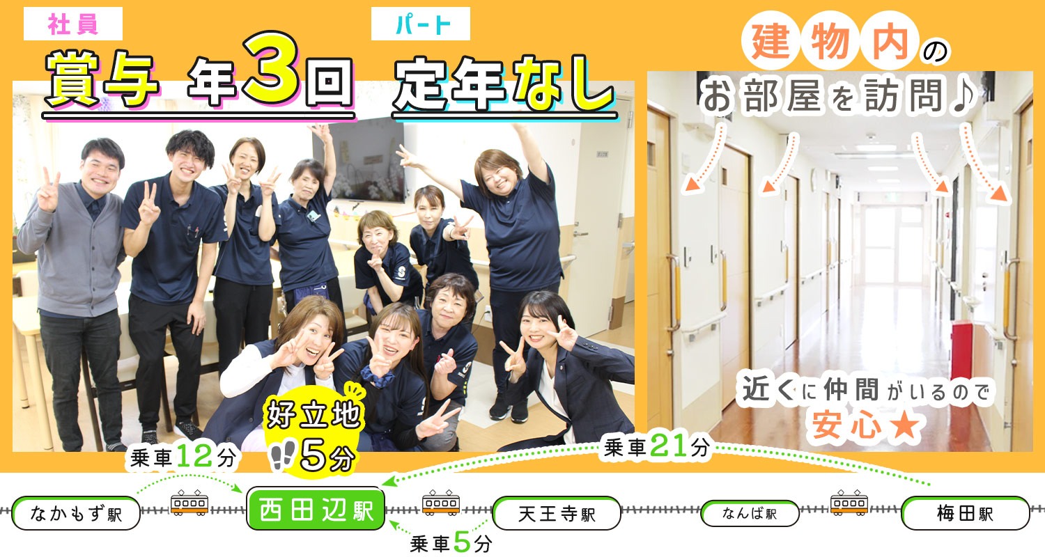 | 給 与 | (1)時給1530円~1630円以上 (2)時給1560円~1660円以上 ★土日祝は時給100円アップ (1)時給1630円以上/介護職員初任者研修修了以上 (2)時給1660円以上/介護福祉士 ※処遇改善手当含む |