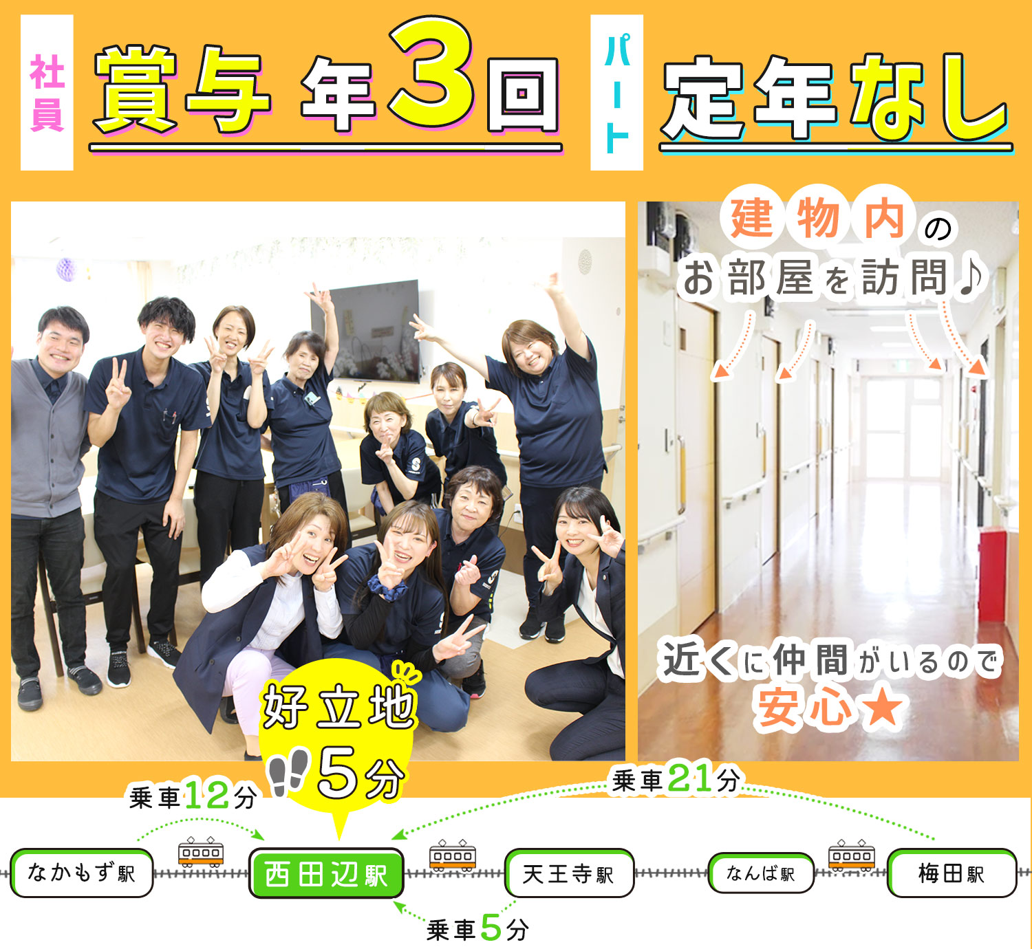 | 応募方法 | ◇ お気軽に【応募する】ボタンよりご応募ください ◇ 24時間受付中です 私服面接OK! まずは見学も歓迎!※希望者のみ 施設の雰囲気や一緒に働く仲間を見てからの応募でも大丈夫です。 □□□ 電話での応募も受付中! 「ジ ョ ブ ポ ス タ ー を見て応募したのですが」と、 お電話すると、スムーズです! |