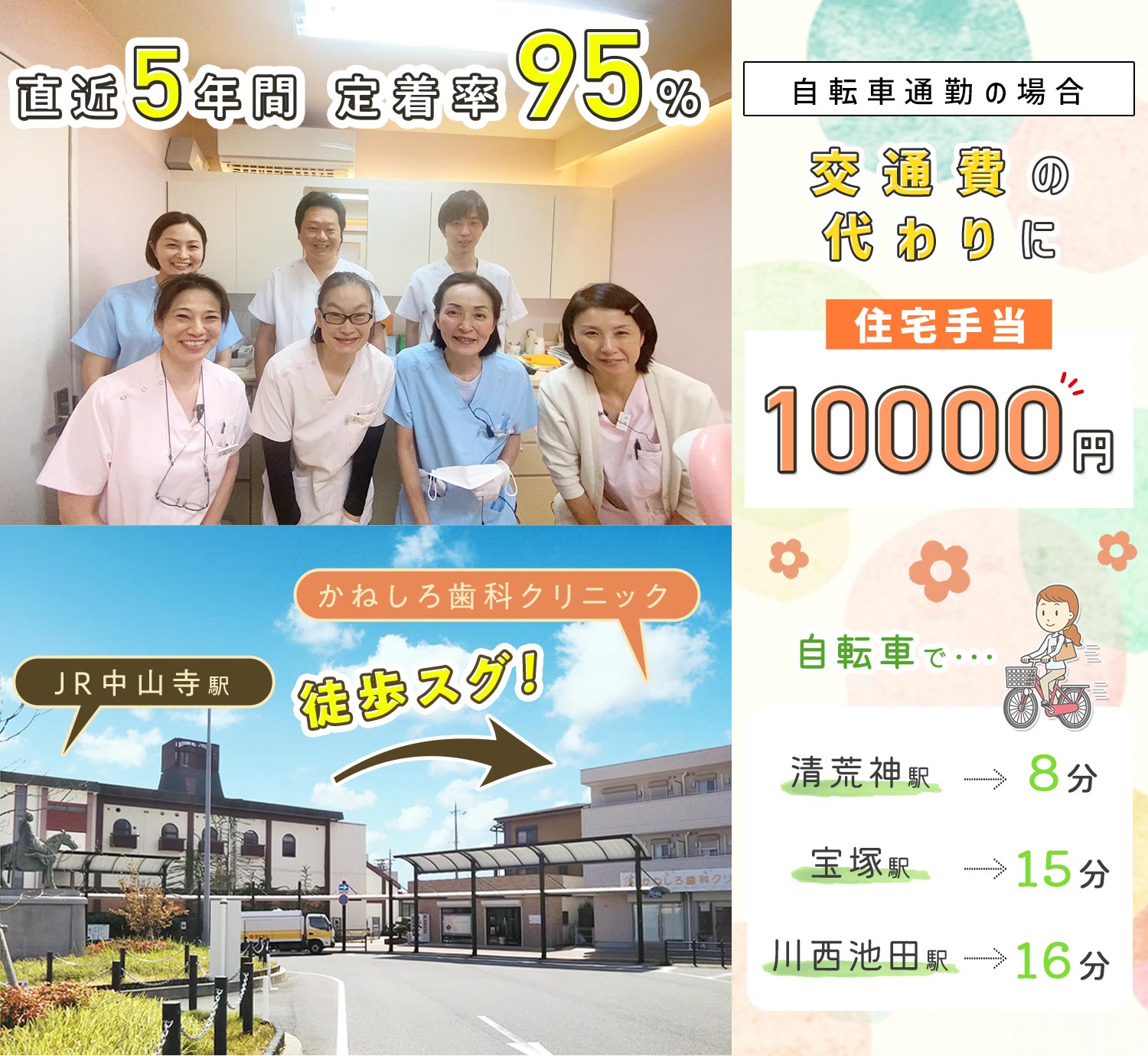 | アクセス | [宝塚市]JR 中山寺駅・北側出口から徒歩30秒 阪急 中山観音駅から徒歩10分 ※自転車貸与あり(中山観音駅近くの駐輪場代も支給) |