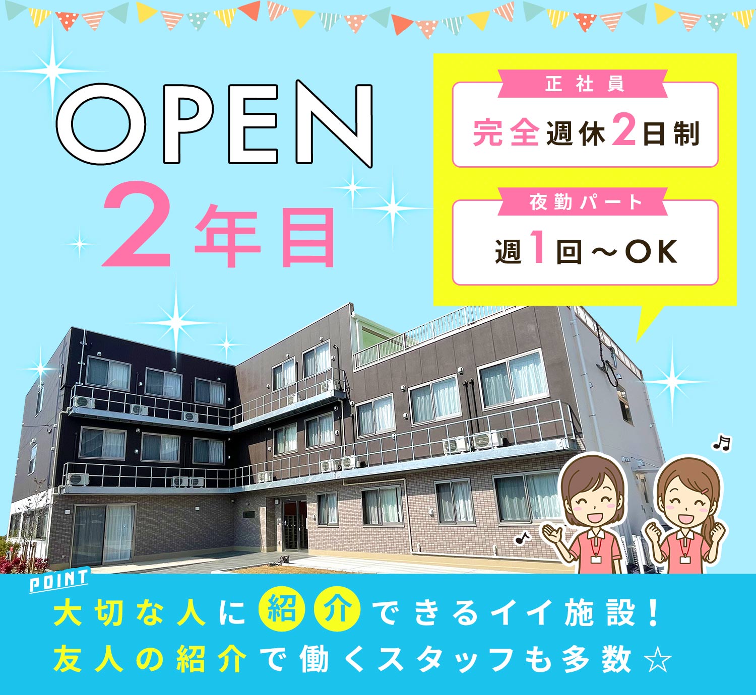 | 仕事内容 | 介護職/オープン2年目[社] 住宅型有料老人ホームでの介護業務全般。 入居者様のお部屋を訪問し、身体介護や生活援助をお願いします。 <施設内の訪問介護> 各居室で生活されている入居者様を訪問し、一人一人のために確保された時間の中でじっくり向き合ってのケアが可能! また、訪問介護ですが移動は施設内のみなので負担が少ないですし、施設内には仲間がいますので安心して働けますよ◎ <心身ともに負担を軽減するツールを導入> ◎記録業務はスマホでかんたん入力!手書きの負担ナシ ◎機械浴(ミスト浴)があり、入浴介助の負担を軽減 <資格取得支援あり> 働きながらスキルアップを目指せるよう資格取得にかかる一部費用を補助しています! 資格取得で給与もUP!(3000円) |