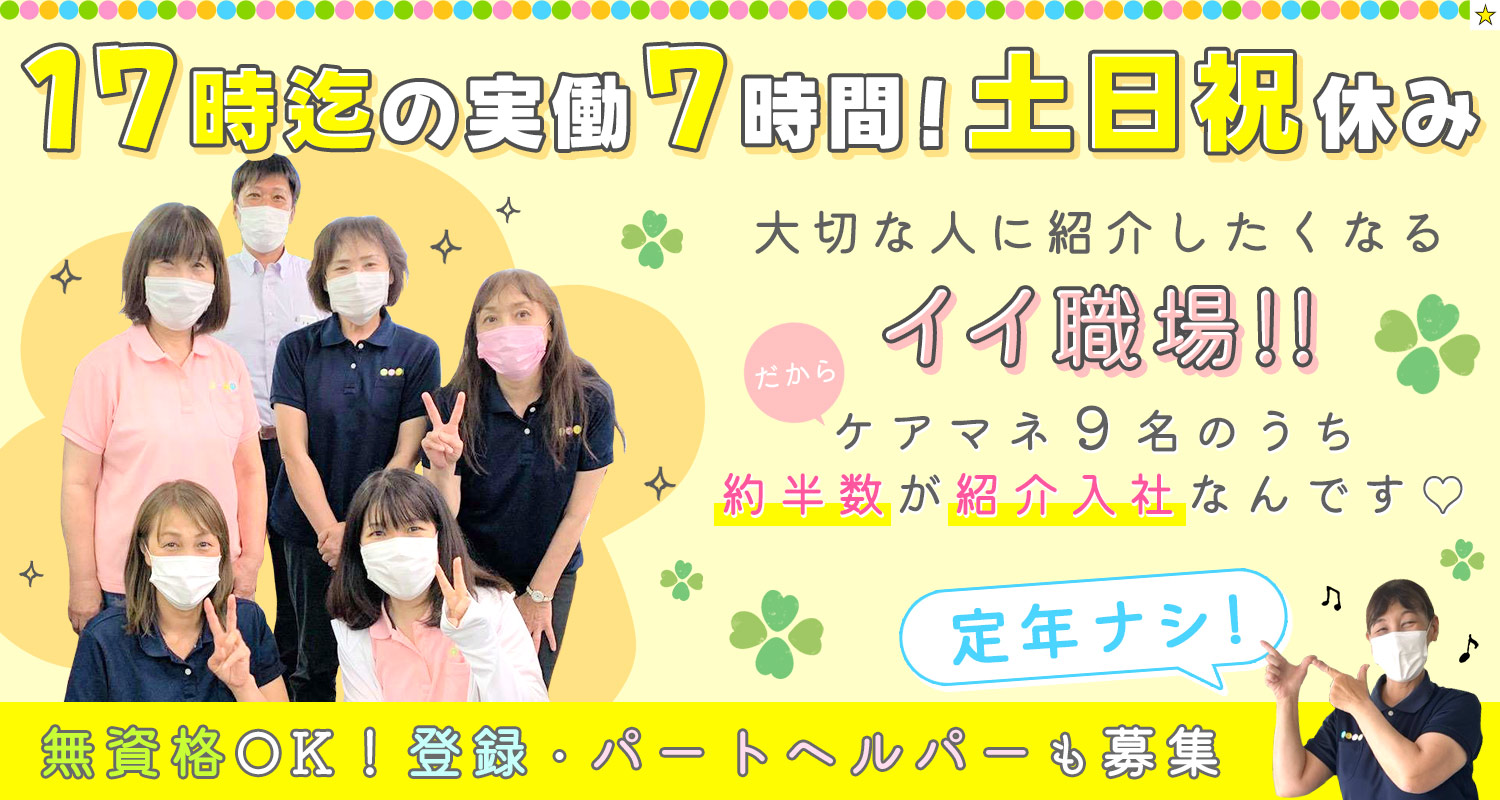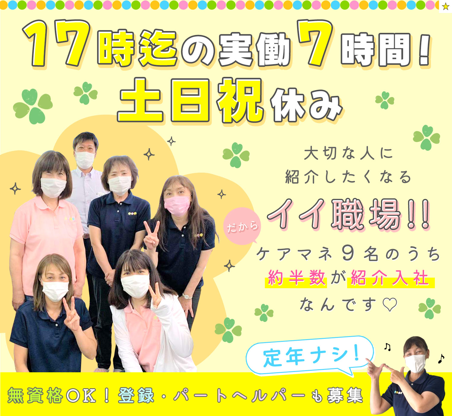 | 給 与 | 月給24万円~33万円 ※経験・能力を考慮 ※入社1年後に5%の昇給あり ※ケアマネ全員が10年連続で毎年昇給しています! ※試用期間3ヶ月/同条件 |