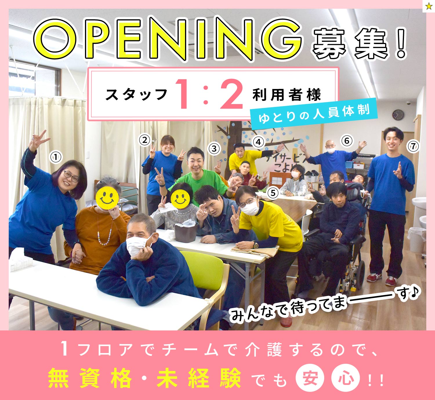 | 仕事内容 | 介護・障がい者チーム介護職/オープニング[社] 障がいをお持ちの方が日中の生活を送られる施設での勤務。利用者様の身の回りの介助や日中活動の支援をお願いします。 ■定員20名の小規模デイサービス 1日の利用者様は最大で20名まで。小規模の特性をいかして利用者様ひとりひとりの「一日の過ごし方」に向き合います。 利用者様とスタッフの割合は2:1です。 <1日の流れ> 09:00 お迎え、バイタルチェック 10:00 朝の会、ラジオ体操、ダンス 10:30 レク、園芸、音楽、午前の入浴、散歩 12:00 昼食、口腔体操・口腔ケア、水分補給、お昼寝 13:30 外出、園芸、制作活動 15:00 おやつ、レク 16:00 お見送り、送迎 17:00 片づけ 17:30 終業 |