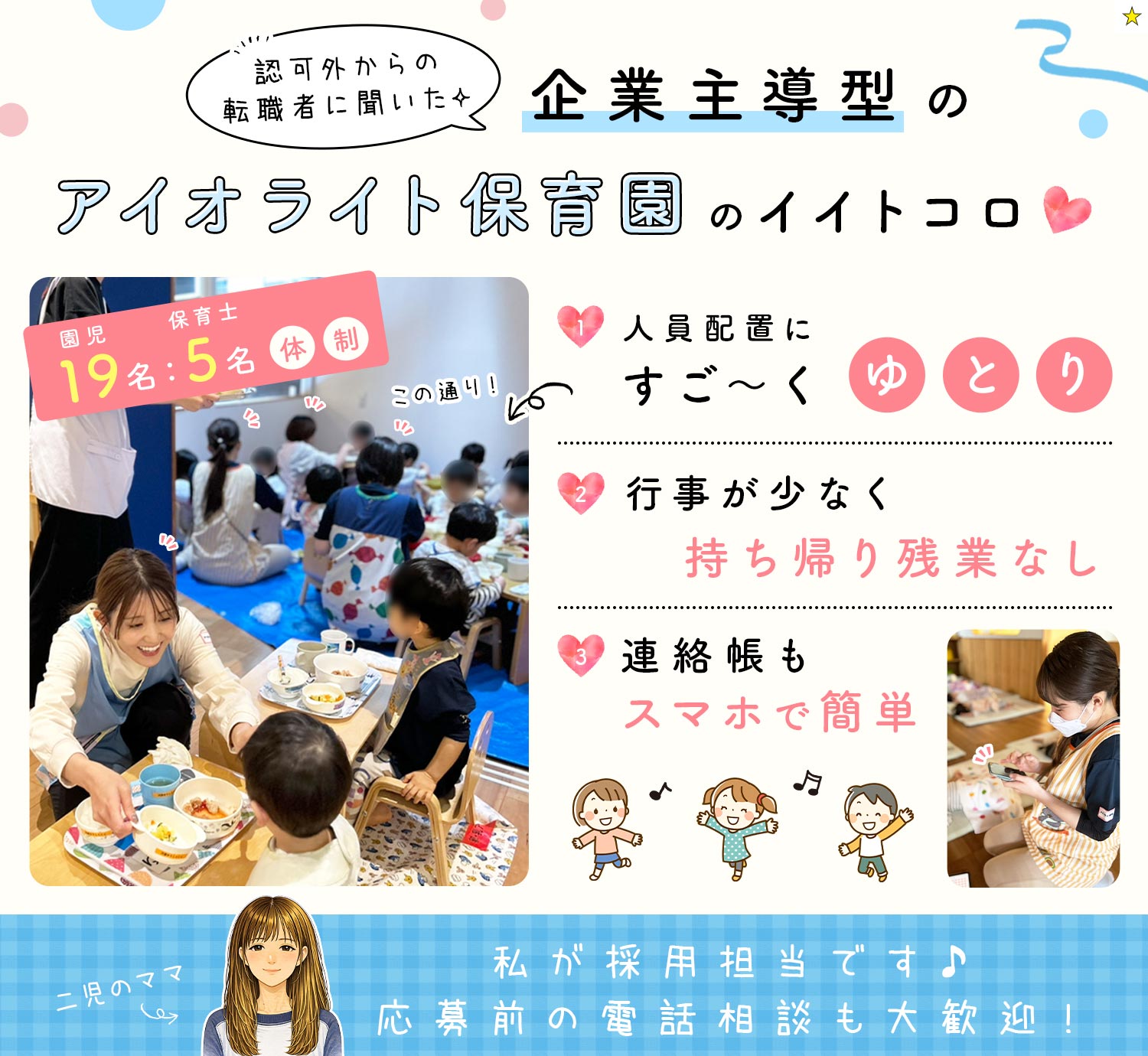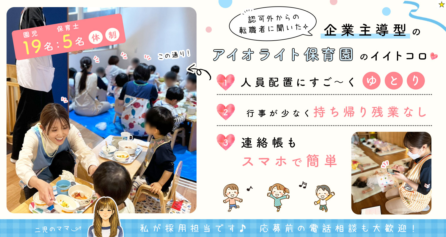 | 仕事内容 | 保育士/土日祝休み[社] 0~2歳の園児(定員19名)の身の回りのお世話、日常生活や遊びを通じた心身の発達サポート、連絡帳の記録(スマホで簡単)、保護者と職員間のコミュニケーション対応など、保育業務全般をお願いします。 ◎ピアノがひけなくてもOK! ◎連絡帳はアプリで管理!事務作業の手間を削減しています! ◎園児19名を保育士10名で担当(1日あたりは5名)!担任制ではないので、みんなで助け合いながら園児をサポート! |
