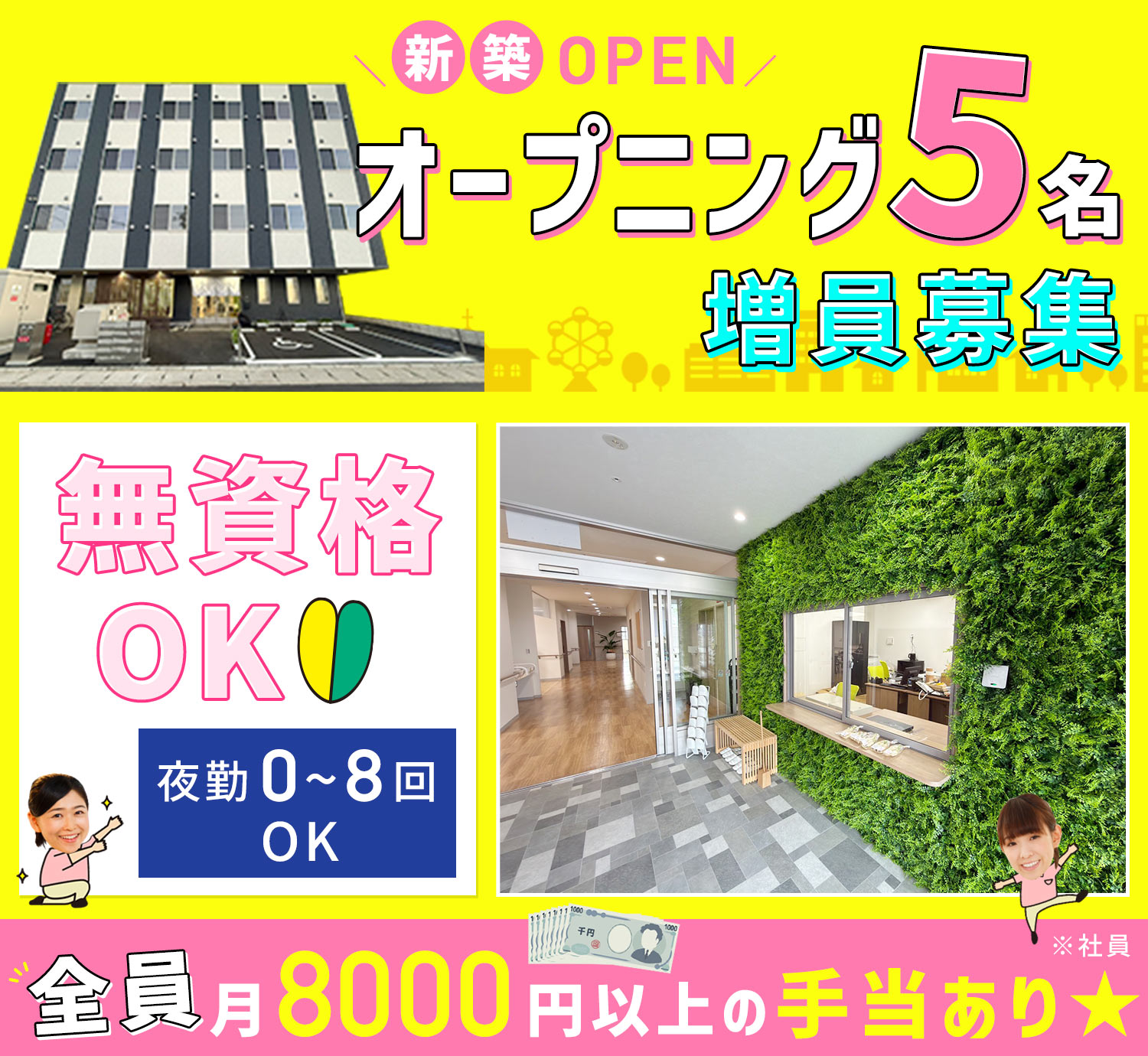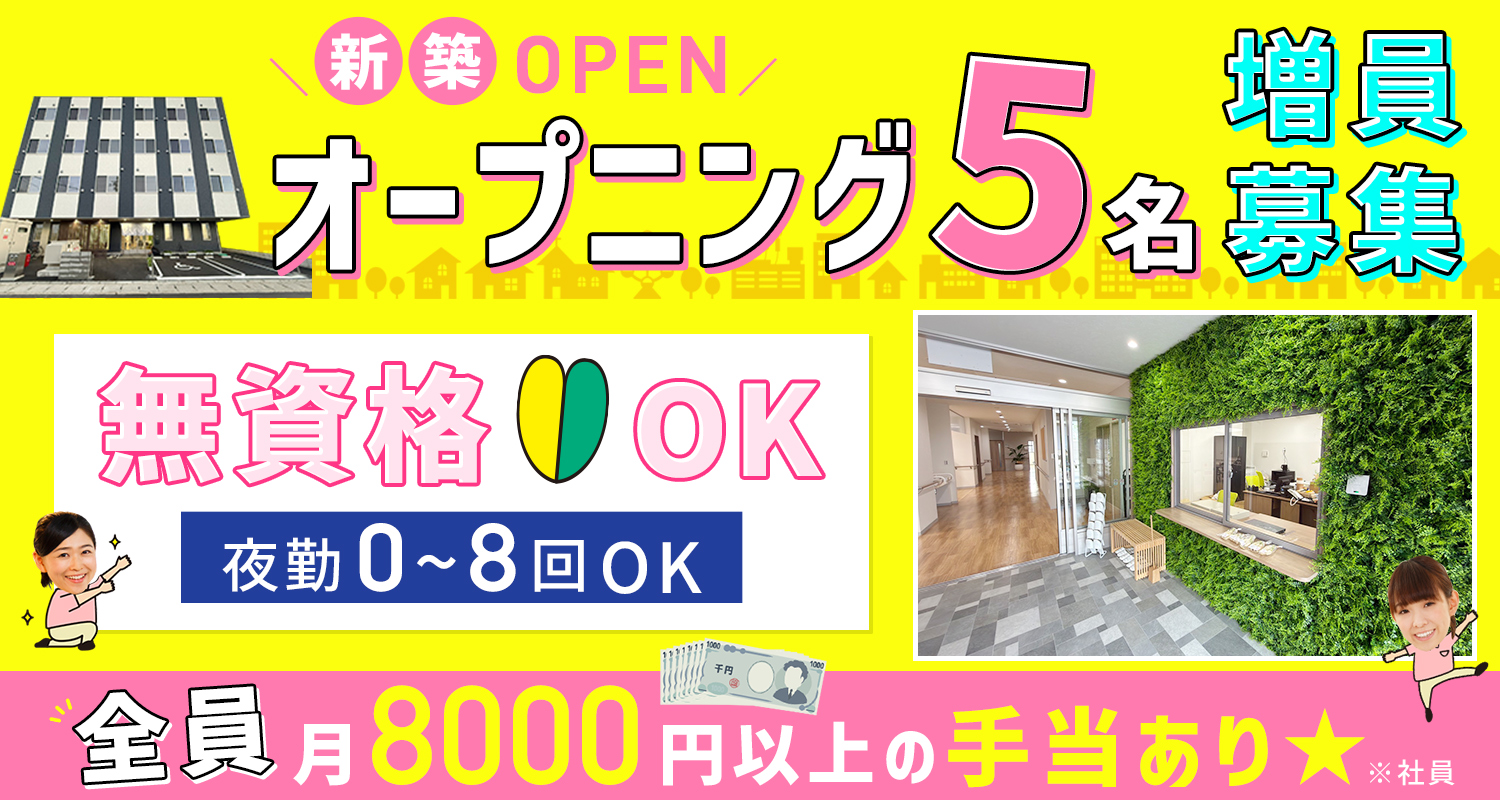 | 仕事内容 | (1)週休3日の介護職/オープニング[社] (2)日勤のみ・週休3日の介護職/オープニング[社] 完全新築OPEN、定員56名の住宅型有料老人ホームでの介護業務全般。 入居者様の身の回りのお世話(食事・入浴・排泄・生活援助)などをお願いします。 ※夜勤時は夜間の見回りや経過記録の記入、起床準備など #オープニングスタッフ ※24時間看護師常駐!夜勤は4名体制で安心(介護職2名+看護師2名) ※ケア記録はタブレット入力!事務作業の負担を軽減 |