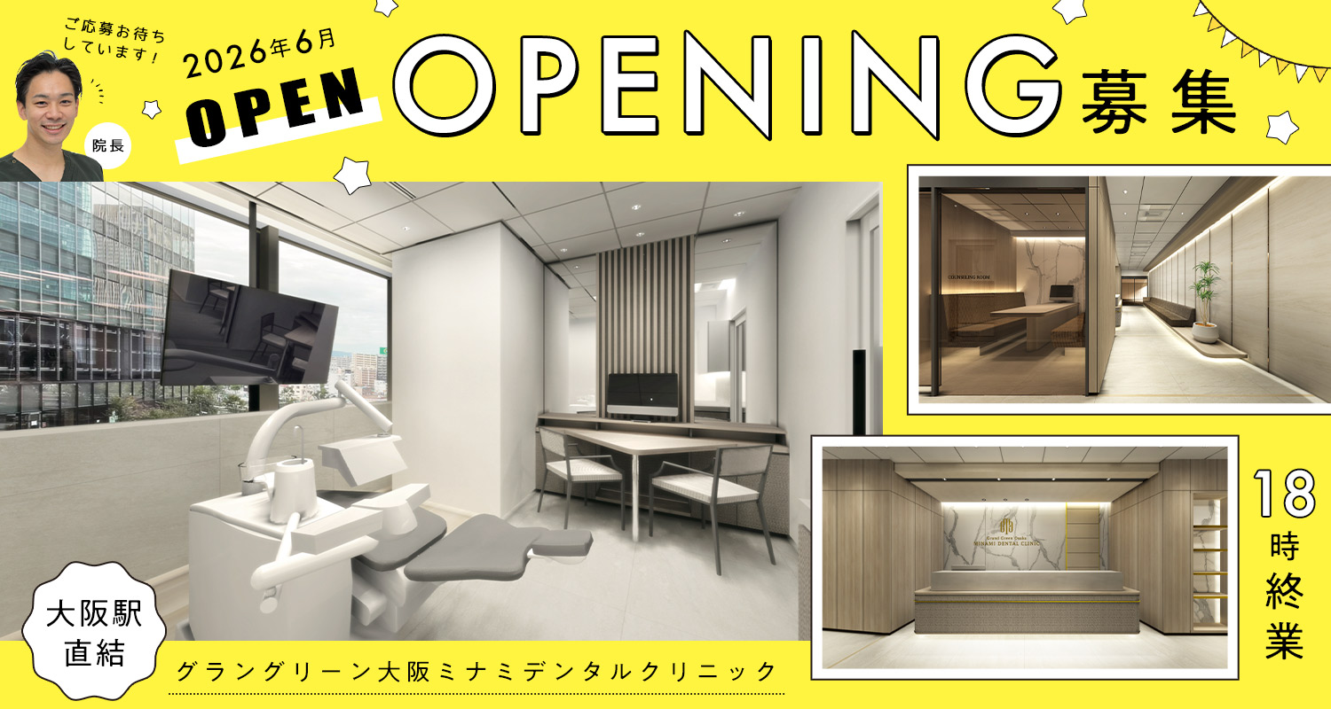 | 勤務地 | 大阪市北区大深町5番54号 グラングリーン大阪 ゲートタワー5階 <面接について> オープン前につき、面接は同法人の『ミナミデンタルデザインクリニック梅田』にて実施します。 大阪市北区梅田2-2-22 ハービス PLAZA ENT 6F ロマンティックコート(阪神 大阪梅田駅・地下鉄 西梅田駅から徒歩スグ) |