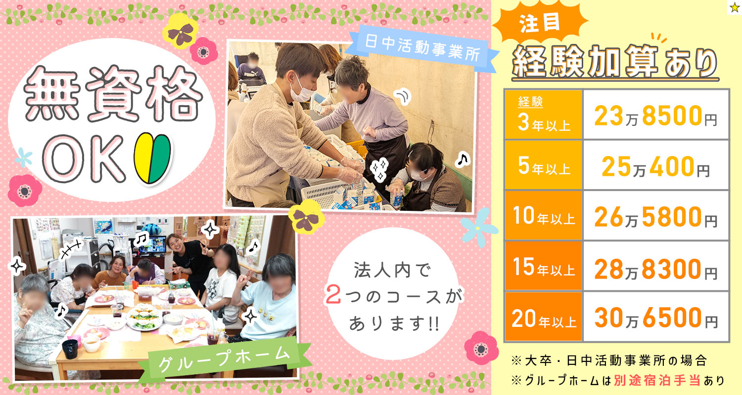 | 仕事内容 | (1)生活サポート・介護/ミドルも歓迎[社] (2)生活サポート・介護/経験10年以上[社] (3)生活サポート・介護/経験20年以上[社] 日中作業所にて、障がいのある方がその人らしく、いきいきと暮らしを送れるように支援するお仕事です。 ■生活・余暇の支援 外出の支援、クラブ活動、余暇活動の企画や実施 (列車旅行、楽器の演奏会、お絵描き教室…etc.) ■作業の支援 (作業内容の説明、仕事の確保、協力して進める等) ・当法人が運営する喫茶店の接客や販売するお菓子作り ・公園の清掃や花壇の管理作業 ・牛乳パックを開いて乾燥させたり、アルミ缶や鉄を回収してプレスする軽作業 ・資源回収(新聞・段ボール・古着) など ※利用者のペースに合わせて、丁寧に作業してもらえれば大丈夫です! <ゆとりある人員配置で、一人ひとりに寄り添える> 10名の利用者に対し、支援員は5~6名と非常に手厚い体制◎ ※将来、スキルアップのため、面談の上、法人内の事業所への施設間異動あり(希望考慮) ※基本的に3年ほどは同じ事業所で配属、転居を伴う異動なし |