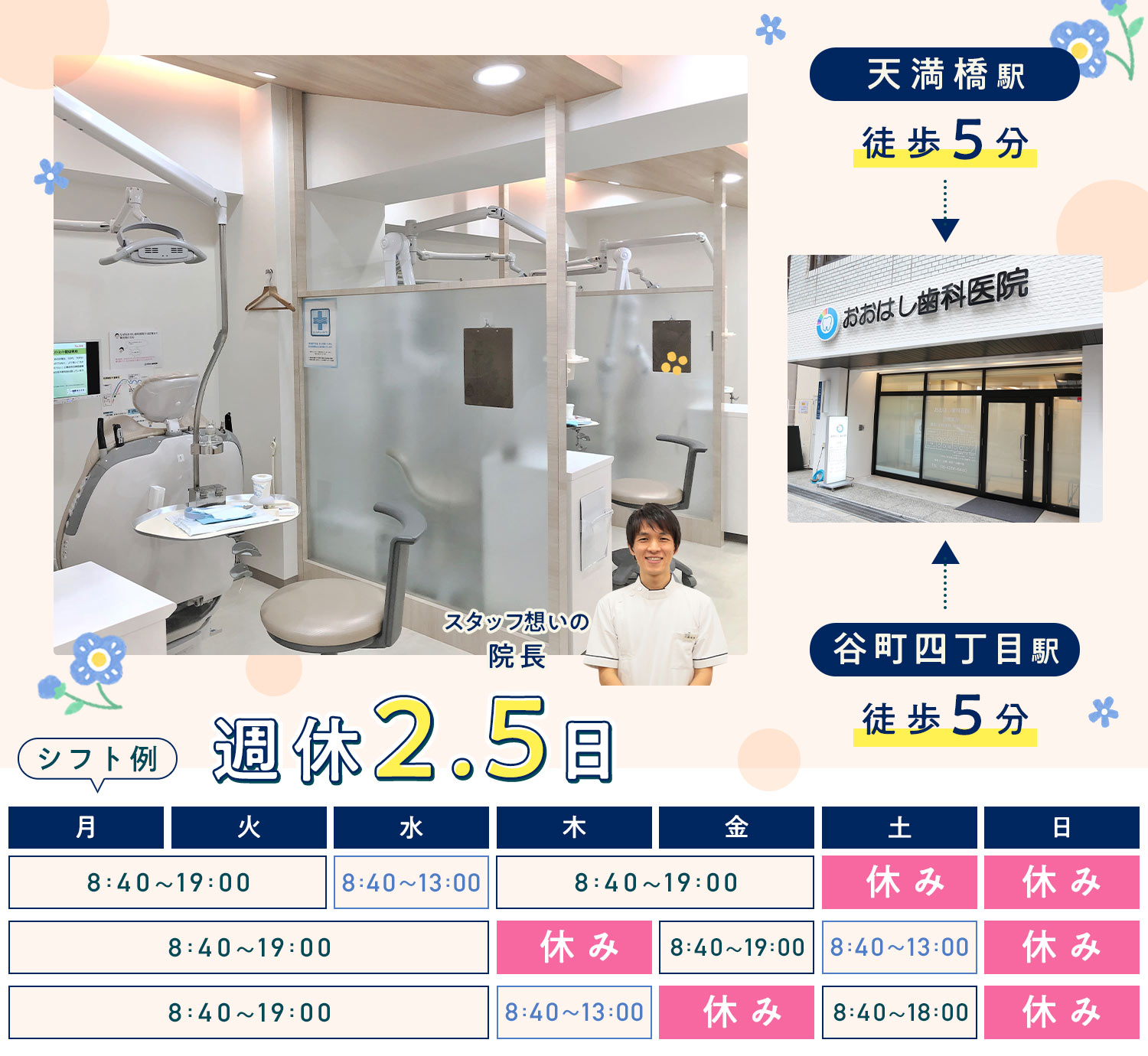| 勤務時間 | ※平日 [午前]8:40~13:00 ※最終受付は12:30 [午後]13:55~19:00 ※最終受付は18:00 ※土曜 [午前]8:40~13:00 ※最終受付は12:30 [午後]13:55~18:00 ※最終受付は17:00 ※出勤時間は応相談 ※残業は月2時間程(1日10分程度) |
