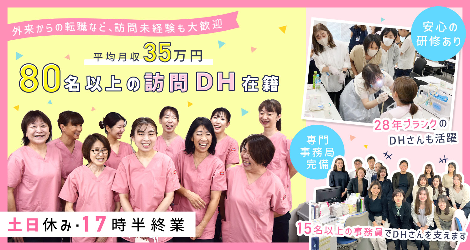 | 仕事内容 | 訪問歯科衛生士/土日休みで平日17時半終業[社] 介護施設等を定期的に訪問し、施設利用者様・患者様への口腔ケアをお願いします。 ・3~4名のチームで訪問(ドクター・歯科衛生士2~3名)※訪問先・施設規模により増減 ※訪問歯科専門の事務局完備 15名以上の事務員が在籍し、レセプト入力、訪問先やご家族様とのTEL対応、診療患者様のリスト作成、スケジュール調整等をサポート。 歯科衛生士さんの労力・負担の軽減を実現しています。 □□□ <1日のスケジュール例> 8:10 出勤 8:30 訪問先へ移動 ※移動車は一般的な乗用車 9:30 午前の訪問先(高齢者施設など)へ到着・診療スタート 12:00 お昼休憩(1時間) ※お昼休憩後、午後の訪問先へ移動 13:30 午後の訪問先(高齢者施設など)へ到着・診療スタート 16:00 終了・帰院 16:30 院内にて片付けと明日の準備 ※使用器具の滅菌消毒は専任のスタッフが対応 17:30 終業 |