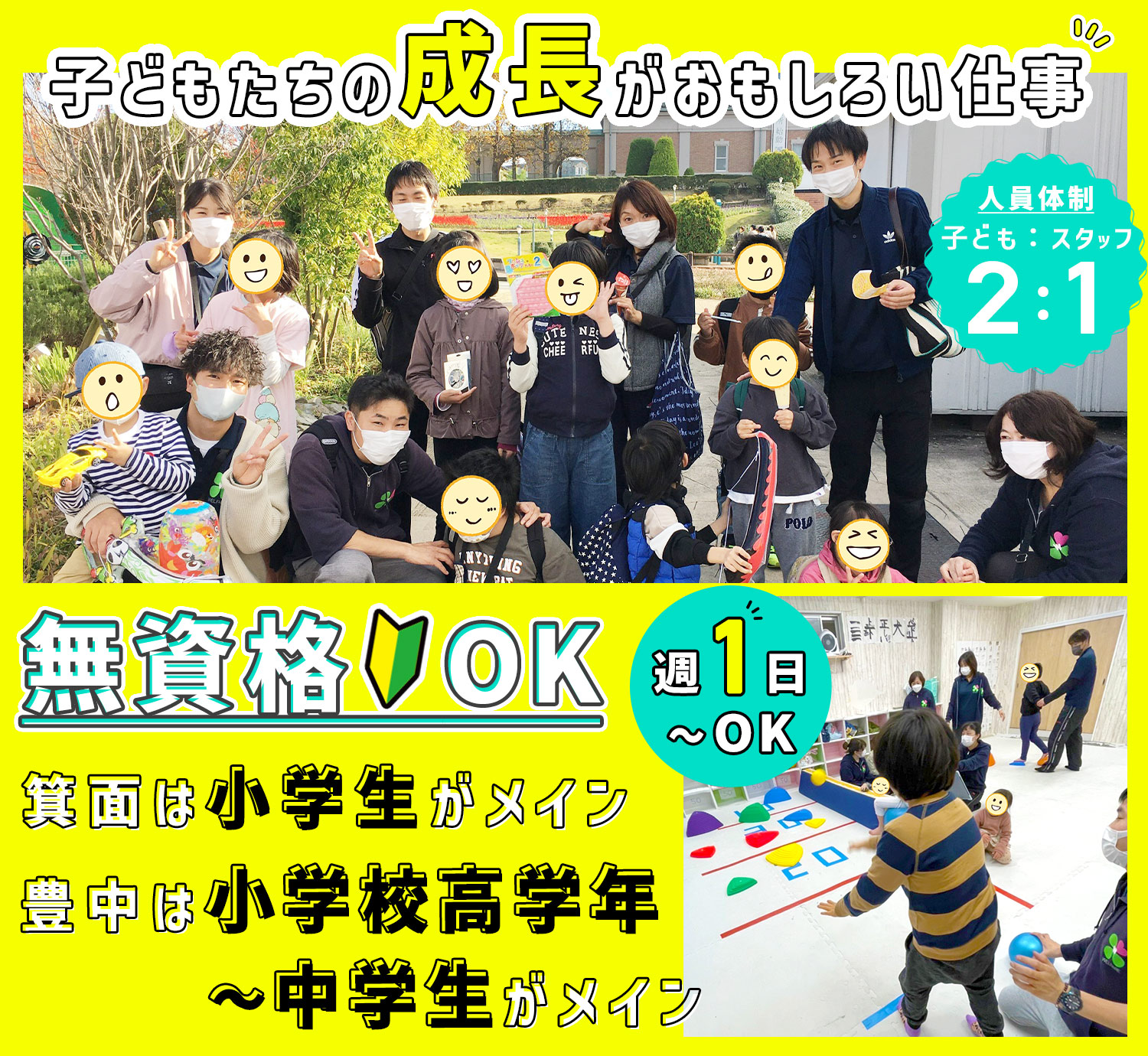 | 応募資格 | (1)無資格・未経験OK ※学生OK/高校生不可 (2)下記a.~c.いずれかに該当する方 a. 教育・心理・社会福祉・社会いずれかの学部、学科などの卒業者 b. 児童指導員任用資格、教員免許(幼稚園・小・中・高いずれか)、社会福祉士、精神保健福祉士、PT・OT・ST、心理士などの資格をお持ちの方 c. 高等学校を卒業し児童福祉事業(学童保育、乳児院、地域子育て支援事業所、保育所、こども園など)の実務経験2年以上 (3)保育士 #ブランクOK ※年齢不問(シニア・ミドルも歓迎) □□□ ※普通自動車免許(AT限定可)お持ちの方も歓迎 運転免許がない方、運転が苦手な方も応募OK |